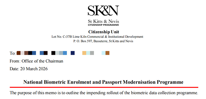 CBivisa News:圣基茨时间3月20日,圣基茨移民局发布官方通告:2026年4月14日开始,对全球圣基茨和尼维斯公民实施生物识别数据采集。